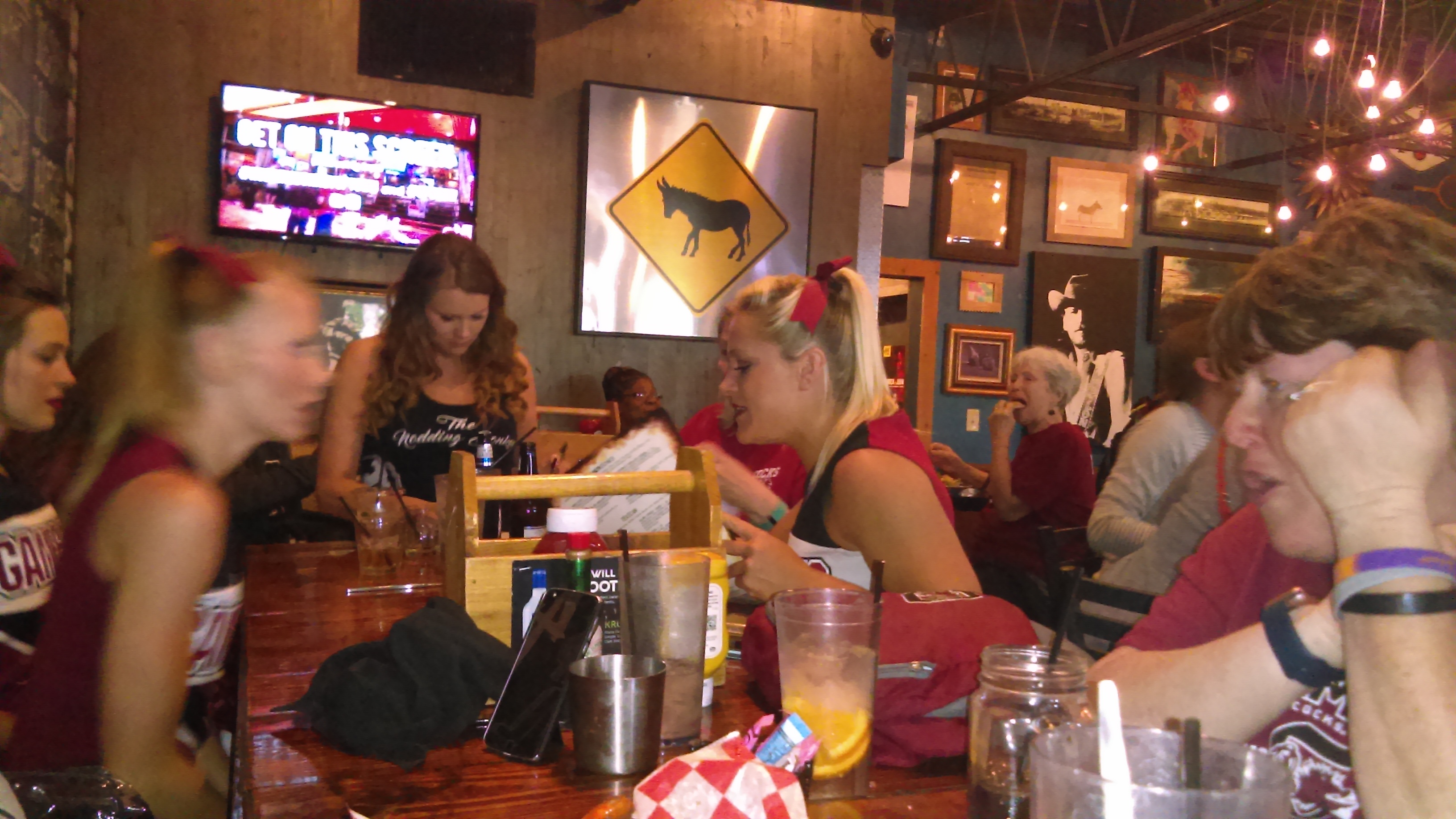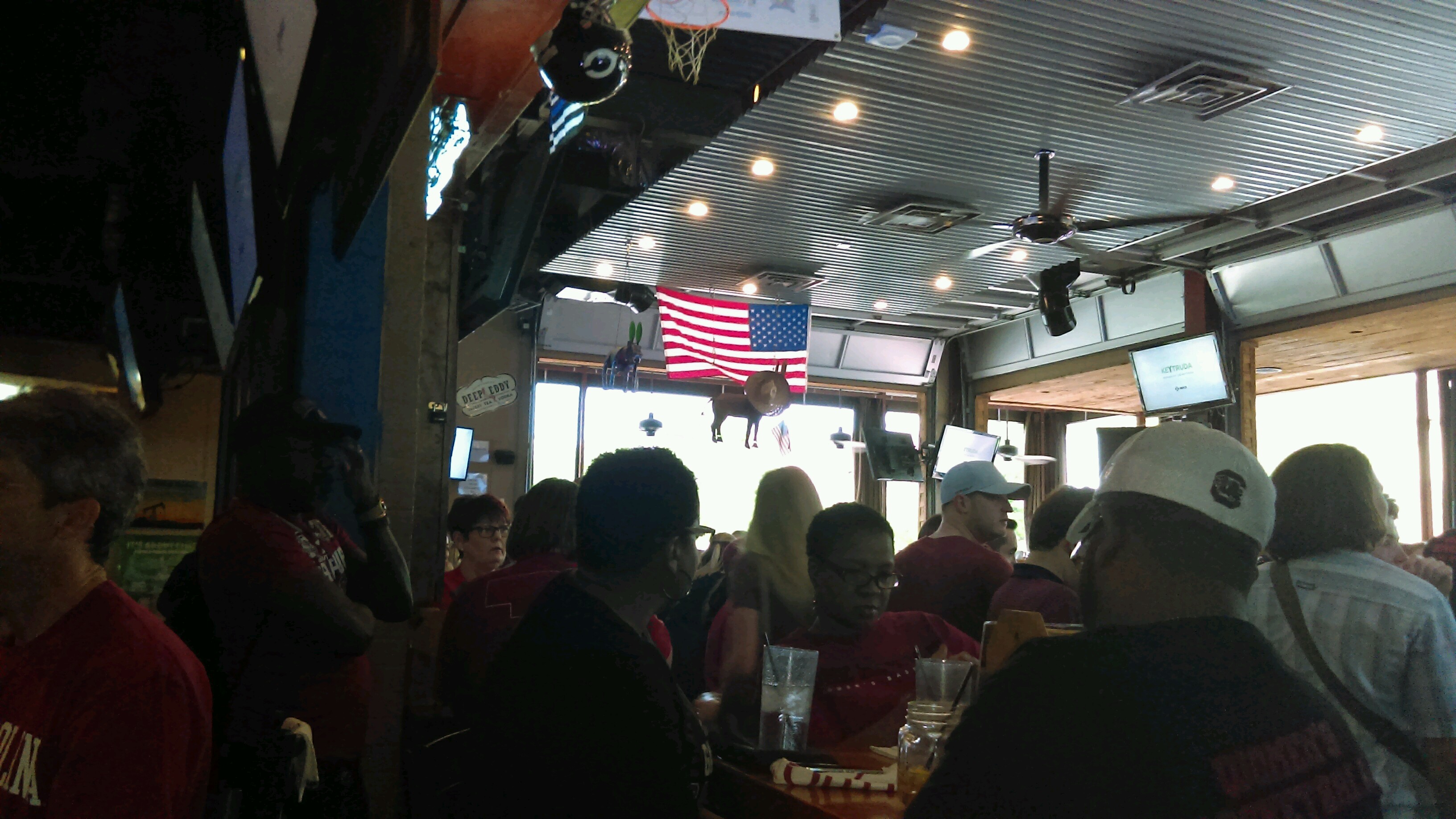 Gamecock fans who are in Dallas for the women’s Final Four gathered late this afternoon at a local tavern called the Nodding Donkey to watch their men play in the semi-finals of the Final Four against Gonzaga University in Phoenix. It was quite the boisterous atmosphere and the Gamecocks kept it very close in the second half but alas, no cigar.