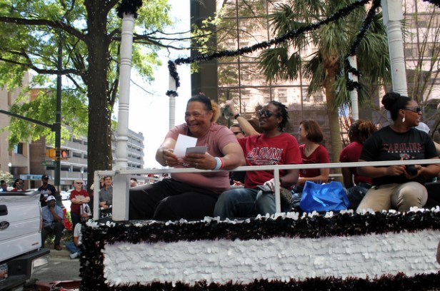 We watched every car carrying VIPs, every motorcycle, a live rooster (Sir Spur, the Gamecock) riding in a small driver-less motorized vehicle, a deputy sheriff on a real big horse, A’ja Wilson’s DJ brother playing festive music, dancing troupes, Cocky the Gamecock mascot and tons of floats – green ones, red ones, silver ones, gold ones – truly any color imaginable in the midst of a caravan of colors as they passed by us on Main Street which was their route to the State Capitol grounds for the closing ceremonies.