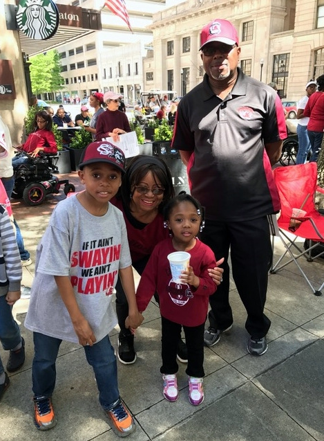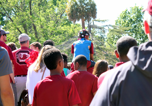 We watched every car carrying VIPs, every motorcycle, a live rooster (Sir Spur, the Gamecock) riding in a small driver-less motorized vehicle, a deputy sheriff on a real big horse, A’ja Wilson’s DJ brother playing festive music, dancing troupes, Cocky the Gamecock mascot and tons of floats – green ones, red ones, silver ones, gold ones – truly any color imaginable in the midst of a caravan of colors as they passed by us on Main Street which was their route to the State Capitol grounds for the closing ceremonies.