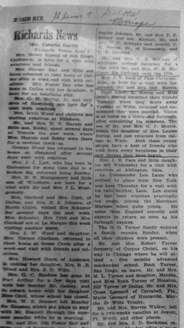 “First Lieut. L. Morris and Miss Selma Boring surprised their friends Tuesday when they drove away Tuesday to Willis, returned and announced they were married. Glenn is at home on a thirty-day furlough, after completing his missions. The son of Mr. and Mrs. G. P. Morris, Selma the daughter of Mrs. Louise Boring, and just returned from college at Waco. Both these young people have a host of friends who wish them every happiness in their new voyage they have begun.”