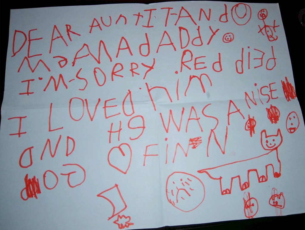 Three months after this fun party, Pretty and I lost one of our most beloved dogs, Red, who was our rescued Welsh Terrier. Red was with us from the beginning of our life together in 2001 so the loss was beyond painful for us both. Several days after his death, five year old Finn sent this note.