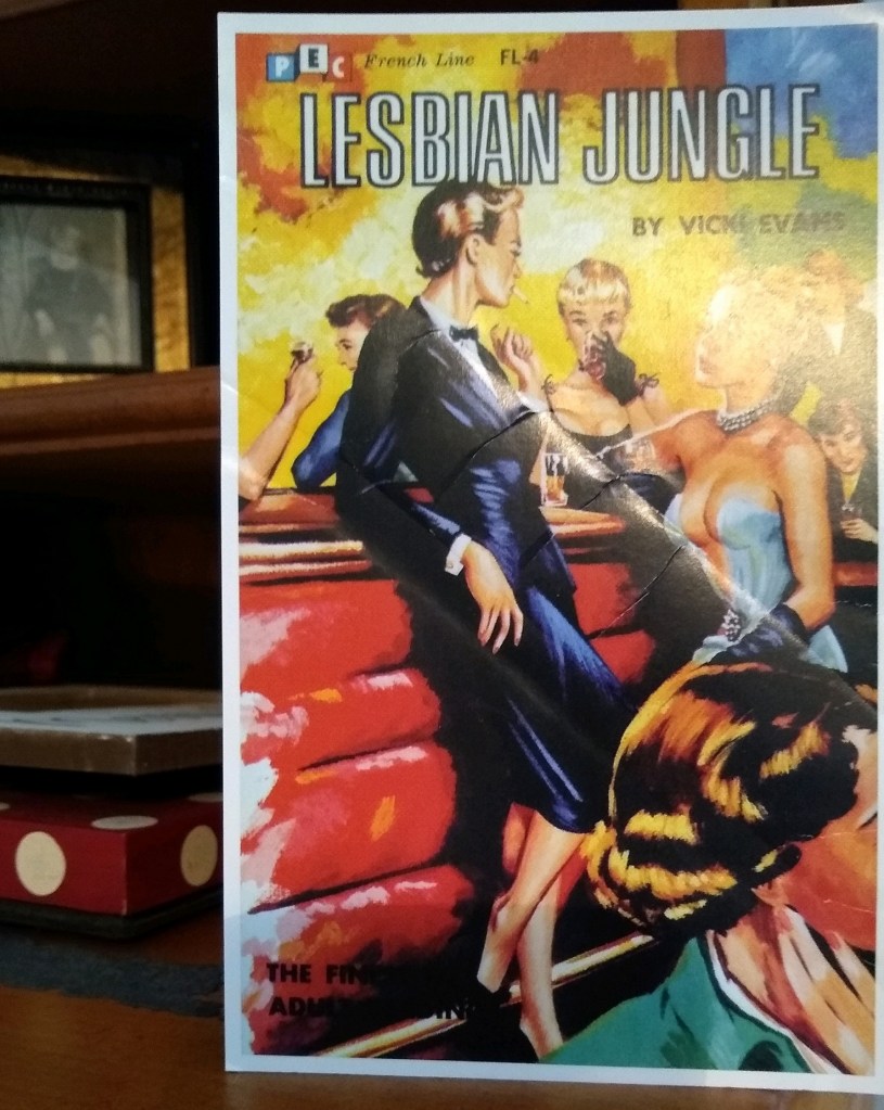 Pretty had a large collection of lesbian vintage post cards in Bluestocking Books in the early 1990s, and one of them is now part of my little sandwich bag conglomerate collection of cards on my desk. Oh yes, I “rediscover” these gems periodically, and Lesbian Jungle is a favorite. Imagine.