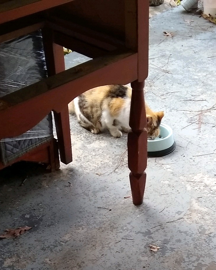 Following the incidence with the Bully Cat in our carport three weeks ago, and perhaps coincidentally with much cooler weather, sightings of Lilibets went dark. That is to say, as quickly as the stray cat made us her new best friends, she vanished. Pretty and I became alarmed when she didn’t make her normal breakfast and dinner times but assumed she must be “wintering” at Neighbor John’s house in the heated condo he provided. Perhaps he now served Fancy Feast, too. I skulked outside John’s house so many times looking for a glimpse of the cat I was afraid I might be mistaken for stalking. (Skulking a lot is not the same as stalking.)