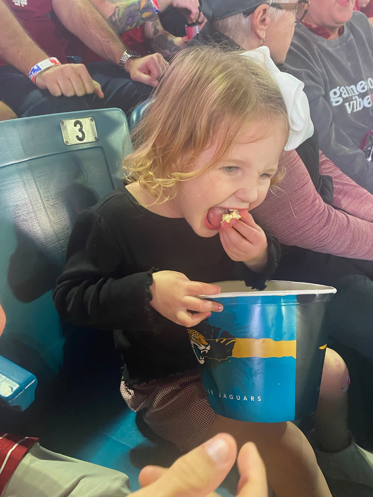 That photo caught her at the perfect second. I can’t tell if she’s more focused on the game or the popcorn!