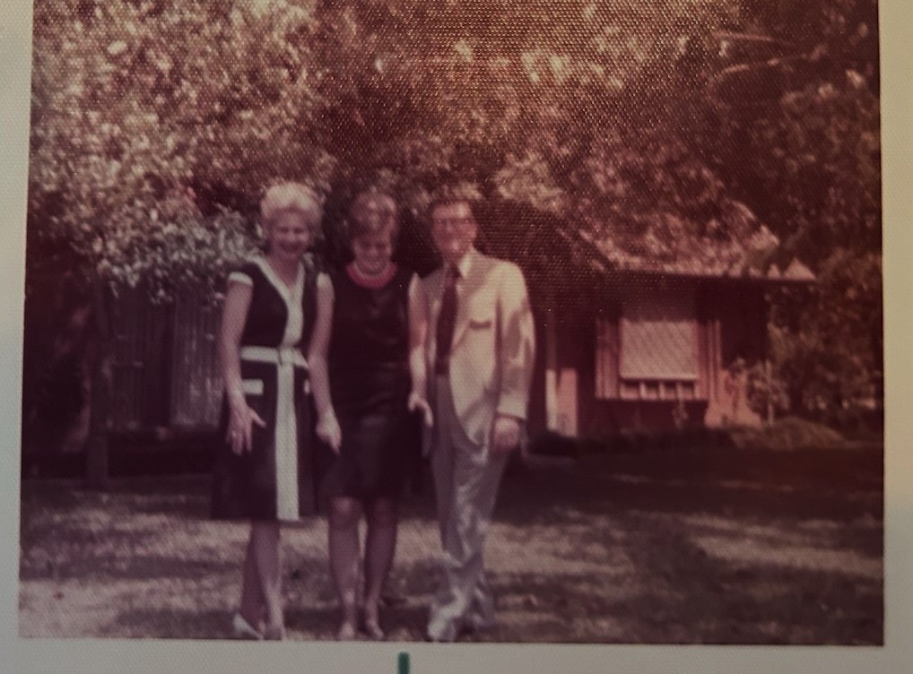 Mom, me, and Dad in front of our home