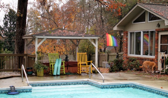 The last picture of this piece in 2018 caught me by surprise because I had forgotten about the original hot tub hidden behind the two rockers under a small portico; hot tub gone, portico torn down to be replaced by a small screen porch the following year. Rockers didn’t survive, either, gradually deteriorating in the elements like my knees worn away by time. Pride Flags flew from day one in 2017, replaced with new ones through the years but keeping watch over the changes in our lives as surely as the shepherds in the fields keeping watch over their flocks by night.