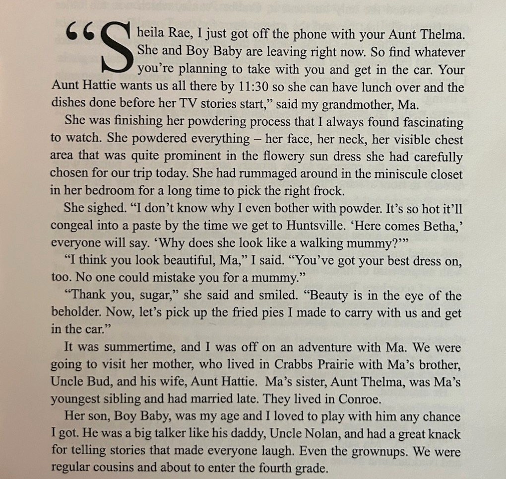 When I was a little girl growing up in the 1950s in the small town of Richards, Texas, (pop. 500 counting dogs and chickens according to my granddaddy) the summers were hot, and entertainment depended on my imagination unless my fifty-something-year-old grandmother I called Ma intervened to drive us to someplace exotic like Crabbs Prairie, an even smaller community than Richards, where her people lived. My relatively young grandmother loved to drive, and I loved to ride while she regaled me with her stories about family and friends – the rides were always too short.