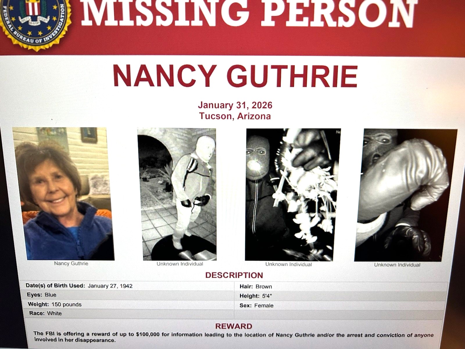 The Federal Bureau of Investigation’s Phoenix Field Office and the Pima County Sheriff’s Department in Arizona are investigating the disappearance of Nancy Guthrie, last seen at her residence in the Catalina Foothills neighborhood of Tucson, Arizona, on the evening of January 31, 2026. She is considered to be a vulnerable adult who has difficulty walking, has a pacemaker, and needs daily medication for a heart condition.