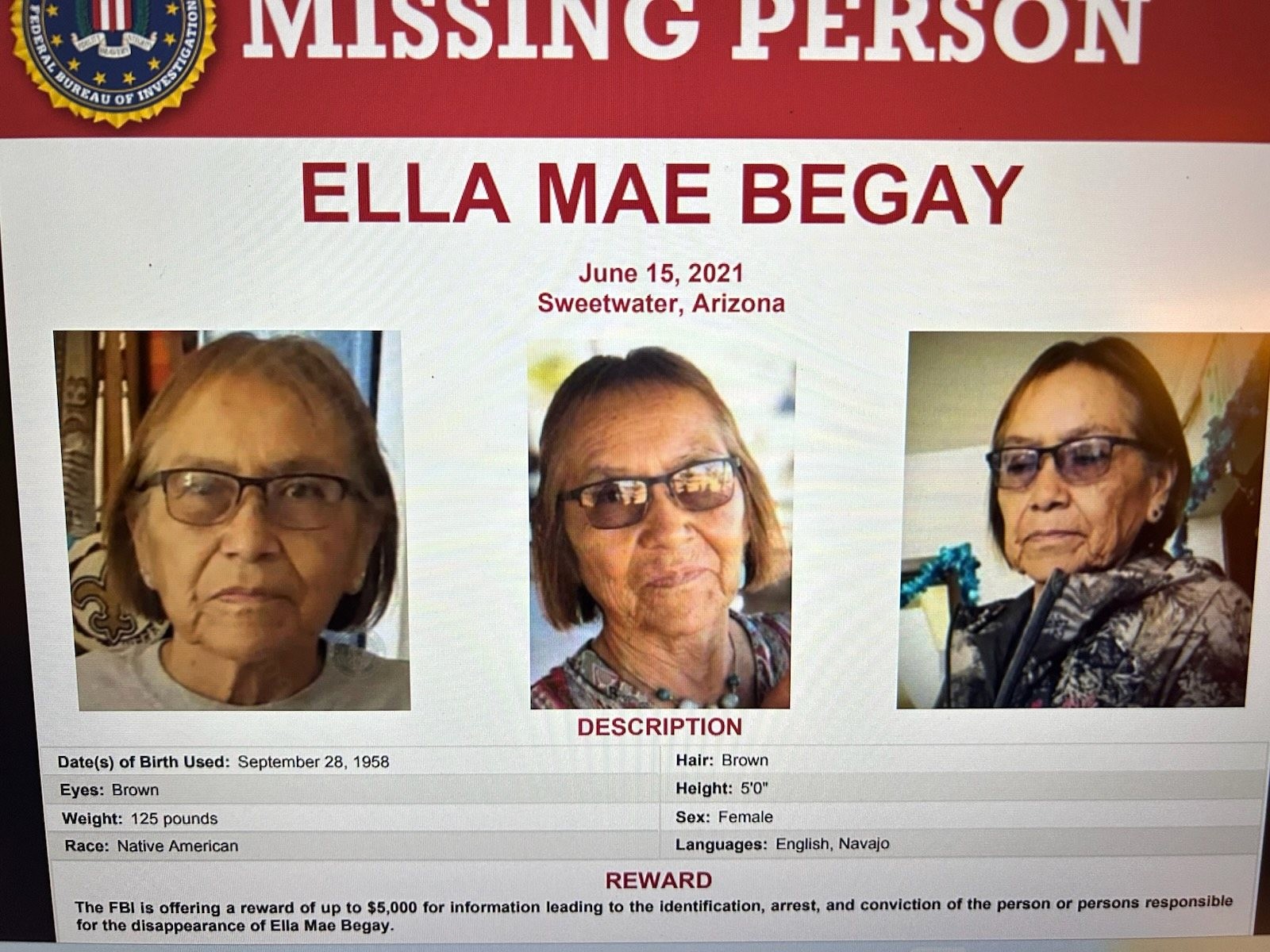 This is a screenshot of the Begay poster from the Kidnappings and Missing Persons FBI website – she was 61 years old when she was reported missing: