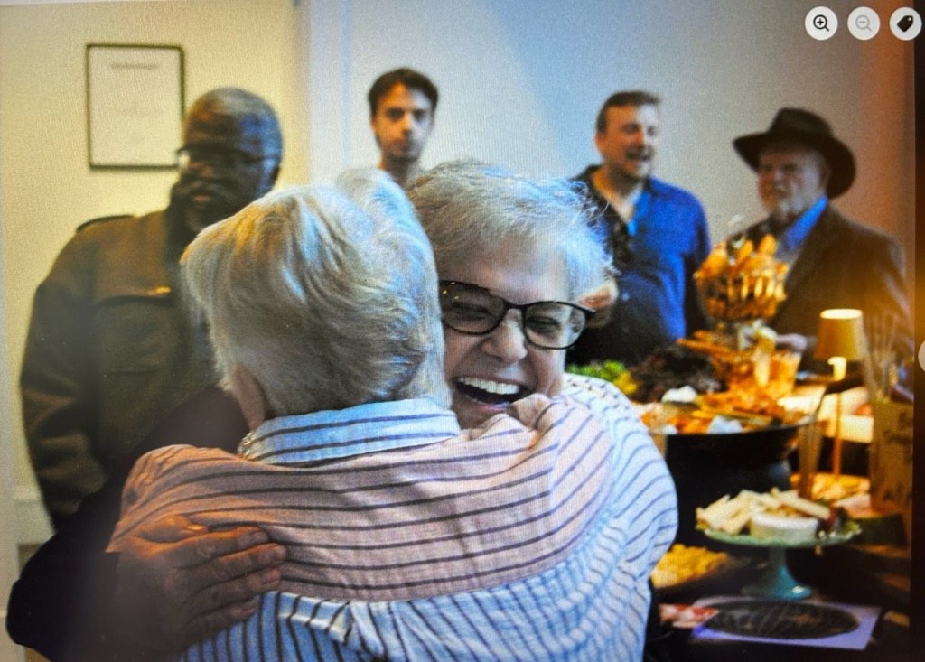 The room erupted in Happy Birthday singing which I later learned was led by our six-year-old granddaughter Ella and four-year-old granddaughter Molly. They had microphones, but I couldn’t hear them above the adults who had chimed in. I recognized all of the people who were standing closer to the entrance, but it honestly never dawned on me that this was a party for my birthday until Jo Ann, one of our California Tahoe Ten friends, came up to hug me and say Happy Birthday! Jo Ann was as happy to see me as I was to see her!