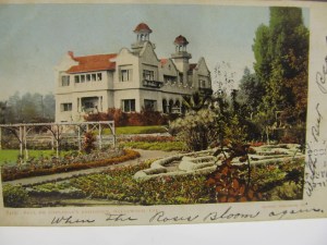 Luke’s interest in architecture was evident from the earliest post cards he sent to Bessie. The Confederate Monument in Mobile was a local landmark for him, but the card itself has a subtle layer of still visible glitter lightly sprinkled on the black and white images. The barely twinkling glitter outlines a line of trees in the background and what appears to be a wreath wrapped around the monument. Classy… and sure to impress a country girl from Alabama City. The second card was more colorful and not from around those parts. It was a picture of Paul de Longprae’s home in Hollywood which at that time had achieved some notoriety. The successful French flower painter built the mansion in 1901 and the house was magnificent with gardens to match that gave him ready subjects for his work year round. The cryptic message When the roses bloom again was a hint of romance from Luke and most likely a reference to a shared moment from his recent visit.