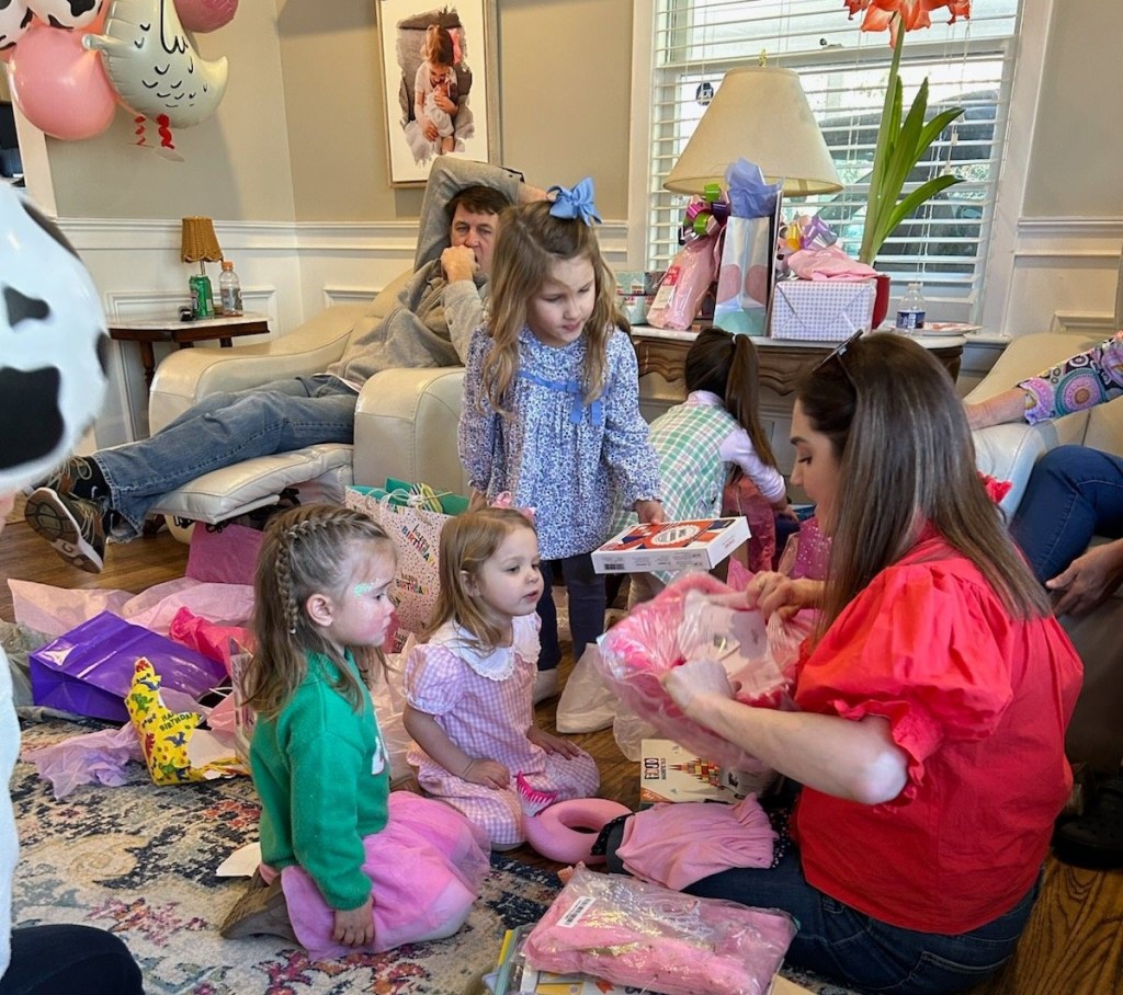 big sister Ella and Mama Caroline help with gifts as Daddy keeps watch