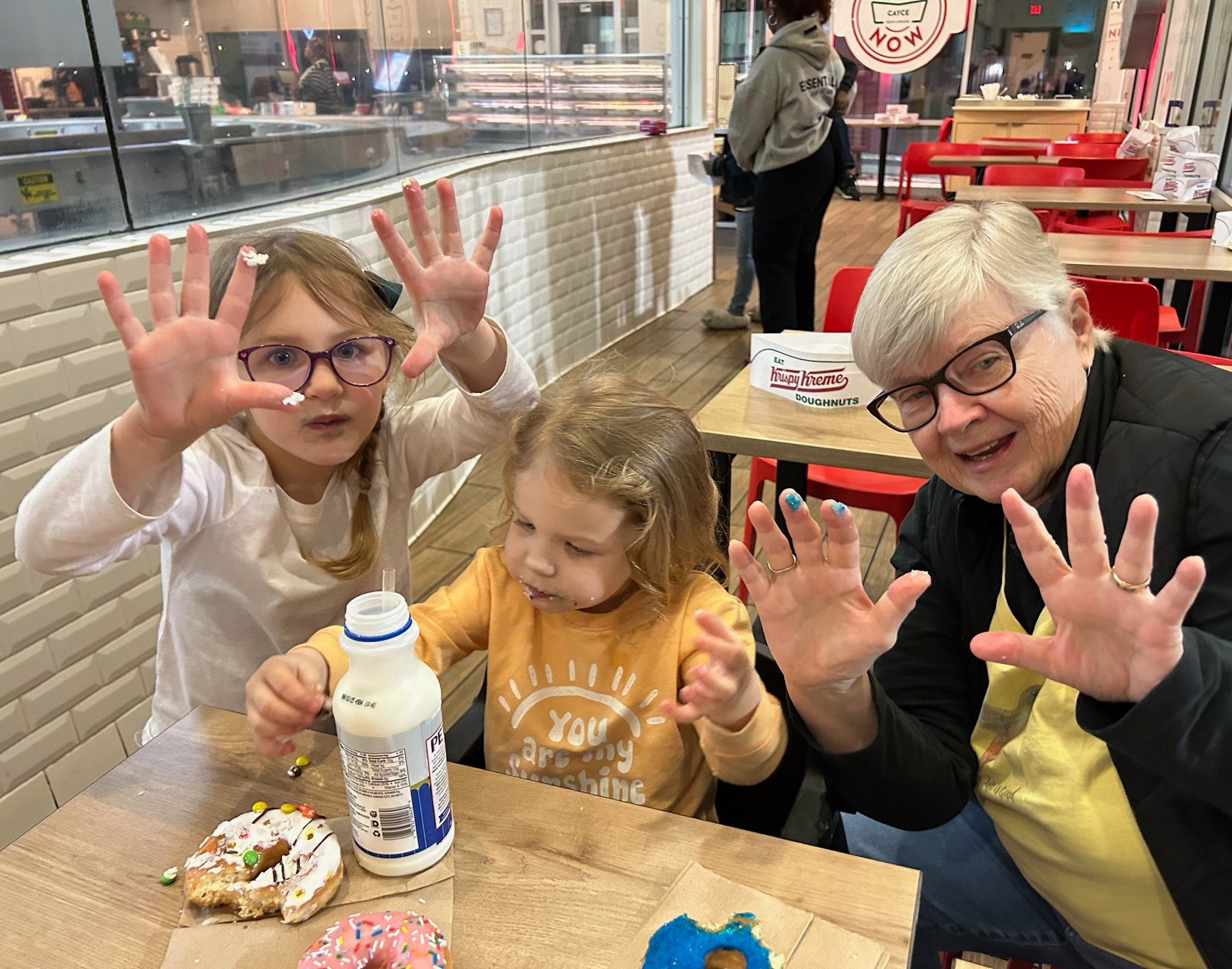 five-year-old Ella, three-year-old Molly, and Naynay at Krispy KremeStore
