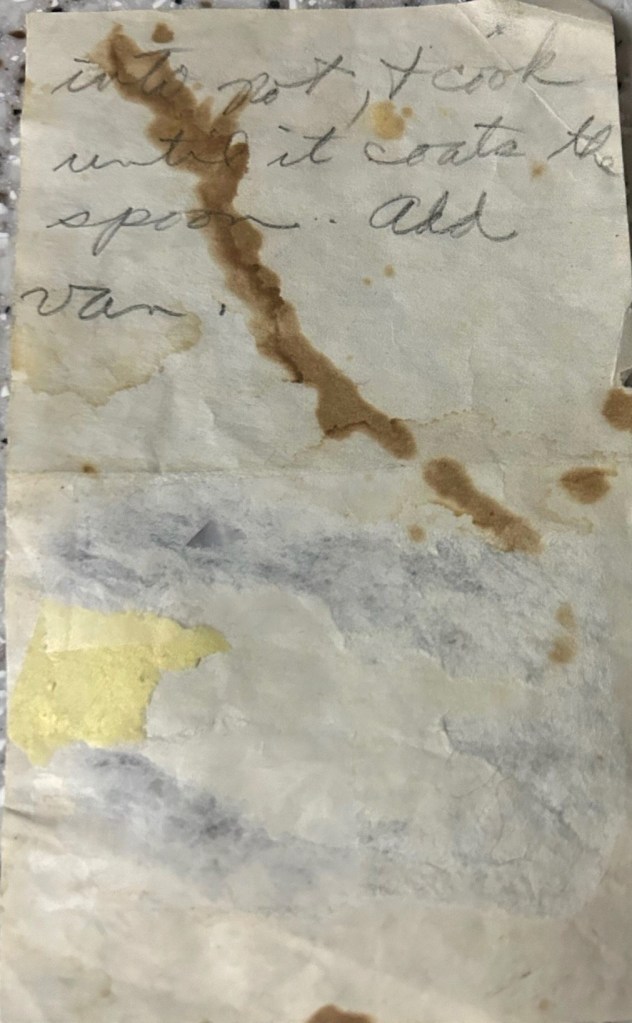 I was amazed to see this little scrap of paper with such evidence of use in the past fifty-five years had traveled from Texas to Wyoming to South Carolina and was transported to the sights, sounds, smells of the custard being poured into delicate china coffee cups by a tall regal woman with soft speech and a warm heart. I’ve made the recipe three times recently and still think it’s delicious – if you can read the scribbling, I suggest you give it a try during the holiday season.