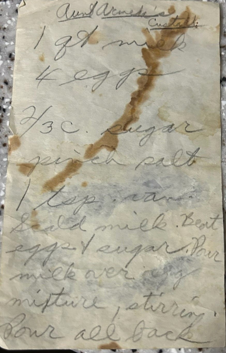 Honestly, I am continually amazed by the goodness of people who care about others. I called Donna to let her know how moved I was by this piece and assured her it would have a place of prominence in my office. Today it sits on an antique writing desk next to my work area. I think my Aunt Armeda would have been pleased for her custard recipe to be displayed. My mother would have said well, I was in a hurry. I know I can write better than that. Did somebody spill egg on it?