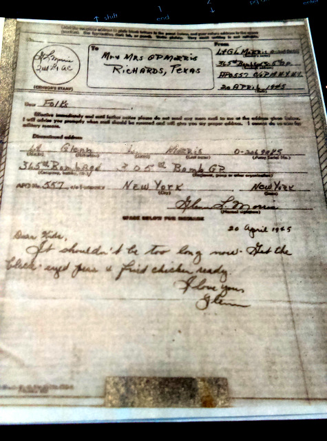He had a break for eight days and wrote to his parents at home in Richards, Texas on January 8, 1945. His older brother Ray was also in England with the 8th. Air Corps. Ray worked on the ground crew for airplane maintenance and loaded the bombs for the flyboys.