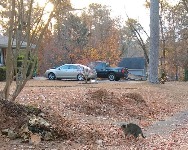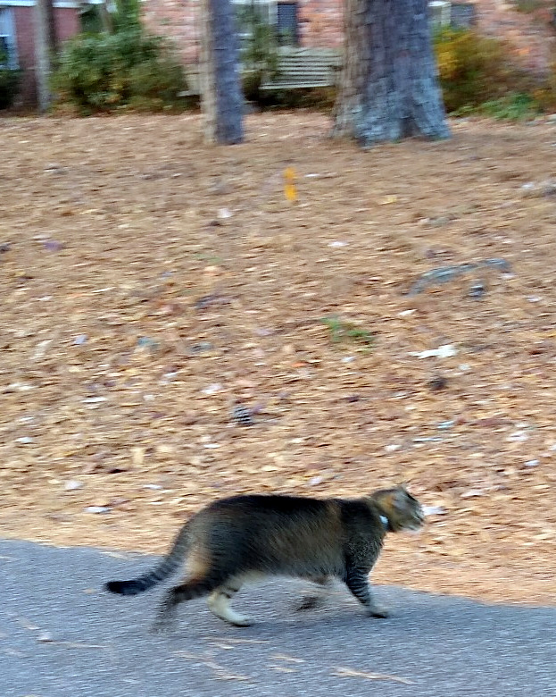 However, 15 minutes later when I finished my walk he mysteriously appeared in front of our house, gave me a wary stare and then looked longingly toward our carport – perhaps for Carport Kitty who never materialized.