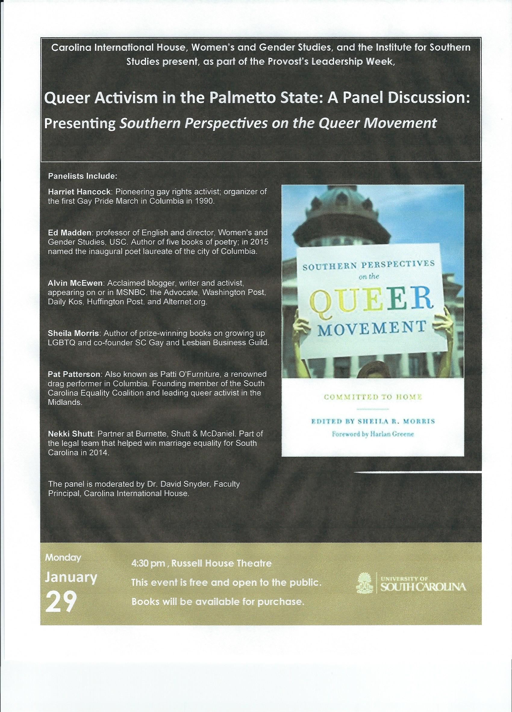 Not pictured here are panelists Alvin McEwen, Dr. Ed Madden and moderator/organizer Dr. David Snyder who did a super job of asking questions that addressed the major themes of Southern Perspectives on the Queer Movement: Committed to Home which stimulated a lively discussion among the six panelists.